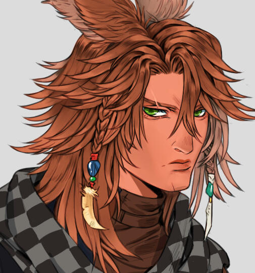 ✦ Has a small braid on his left side, adorned with beads and a single white feather.